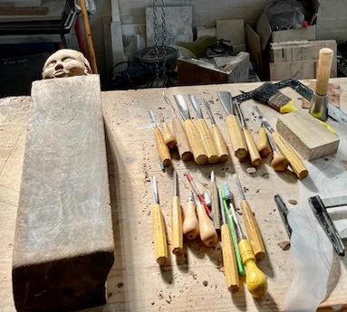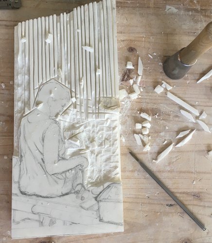 ‘Youth’ series : a current more introspective collection of relief work and hand engraved ‘drawings’ on marble, follow from her solo show ‘Motherships’, where the implication of an uncertain environmental future makes for an unsettling world particularly for young people. Her series explores the beautiful vulnerability of youth as they evolve into the adult world and its strictures. The collection was begun at the outbreak of the war in Ukraine, where young conscripts face tremendous personal challenges in a world not of their choosing.